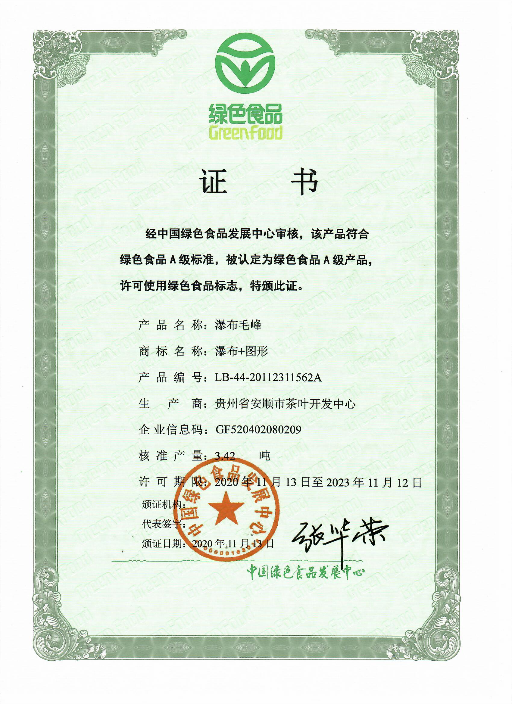 首頁 > 榮譽資質 > 綠色食品(瀑布高級綠茶)