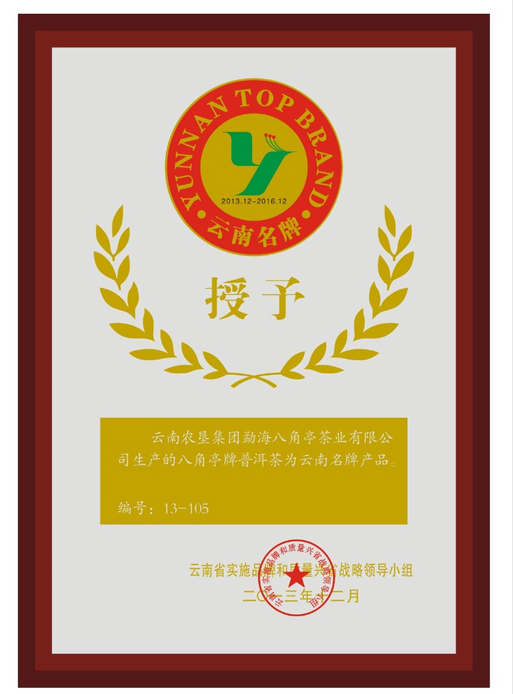 發證機構:   云南省實施品牌與質量興省領導小組 發證時間 :   2013-12-01