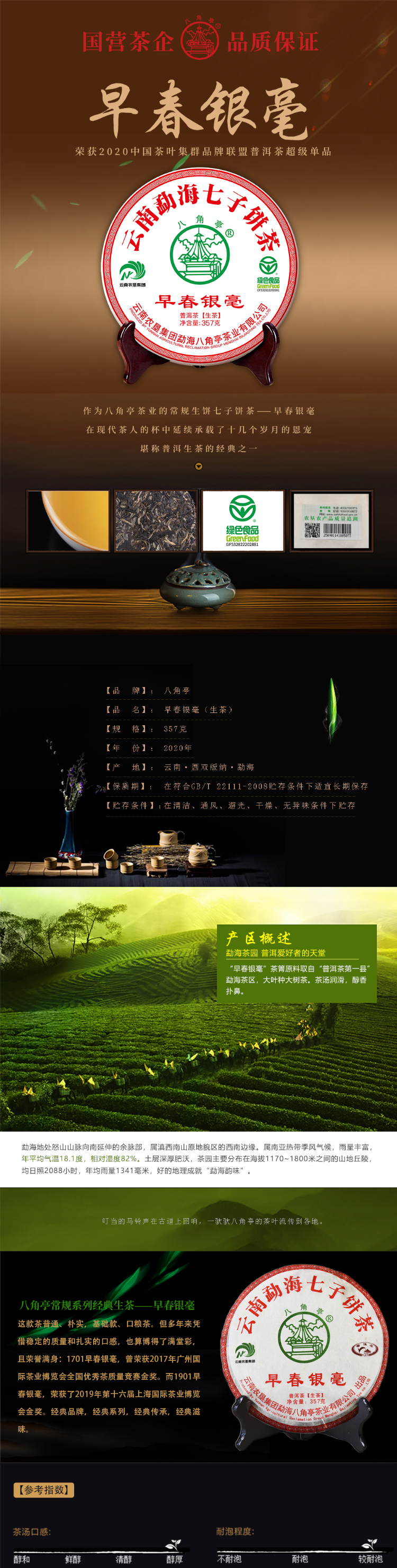 云墾茶業(yè)集團(tuán)下屬茶葉生產(chǎn)企業(yè)——云南農(nóng)墾集團(tuán)勐海八角亭茶業(yè)有限公司原名黎明茶廠,是我國歷史最為悠久的茶企之一,曾位列“中國普洱茶十大知名品牌”“十大最受歡迎茶葉品牌”、“中國普洱茶十大暢銷品牌”中,成為今天市場上最有影響力的品牌之一。公司產(chǎn)品獲得“綠色食品”、ISO9001、 HACCP和云茶品牌(YC)4項(xiàng)認(rèn)證,連續(xù)獲得“云南名牌農(nóng)產(chǎn)品”“云南名牌產(chǎn)品”“云南省著名商標(biāo)”等品牌榮譽(yù),公司生產(chǎn)的多款普洱茶在歷次專業(yè)評比中多次獲得特等金獎和金獎。在2018第五屆中國企業(yè)五星品牌論壇上,云南農(nóng)墾集團(tuán)勐海八角亭茶業(yè)有限公司上榜中國普洱茶行業(yè)影響力品牌——“金芽獎”,公司負(fù)責(zé)人陳勝軍先生獲“陸羽獎”,被授予2017“國際十大杰出茶人”榮譽(yù)稱號。