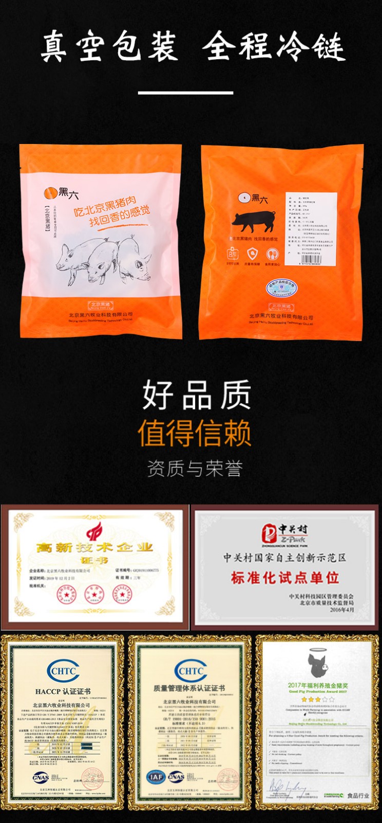 公司利用北京黑豬自有知識產權,通過科技支撐,建立了從基地到餐桌的安全、優質食用農產品加工的全程可追溯體系,“黑六”高品質豬肉受到廣大消費者關注和接受。隨著北京黑豬全產業鏈的延伸和發展,公司獨創的“黑六”品牌日益受到消費者青睞。“黑六”產品通過超市專賣、直銷、電商、餐飲等渠道步入了千家萬戶。被淡忘和追尋的肉嫩味美的北京黑豬肉通過黑六團隊的精心打造,再度成為消費者舌尖上的享受、餐桌上的靚麗一景。
