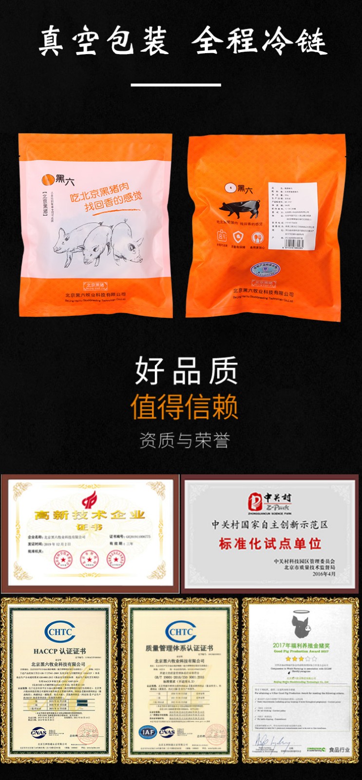 公司利用北京黑豬自有知識(shí)產(chǎn)權(quán),通過科技支撐,建立了從基地到餐桌的安全、優(yōu)質(zhì)食用農(nóng)產(chǎn)品加工的全程可追溯體系,“黑六”高品質(zhì)豬肉受到廣大消費(fèi)者關(guān)注和接受。隨著北京黑豬全產(chǎn)業(yè)鏈的延伸和發(fā)展,公司獨(dú)創(chuàng)的“黑六”品牌日益受到消費(fèi)者青睞。“黑六”產(chǎn)品通過超市專賣、直銷、電商、餐飲等渠道步入了千家萬戶。被淡忘和追尋的肉嫩味美的北京黑豬肉通過黑六團(tuán)隊(duì)的精心打造,再度成為消費(fèi)者舌尖上的享受、餐桌上的靚麗一景。