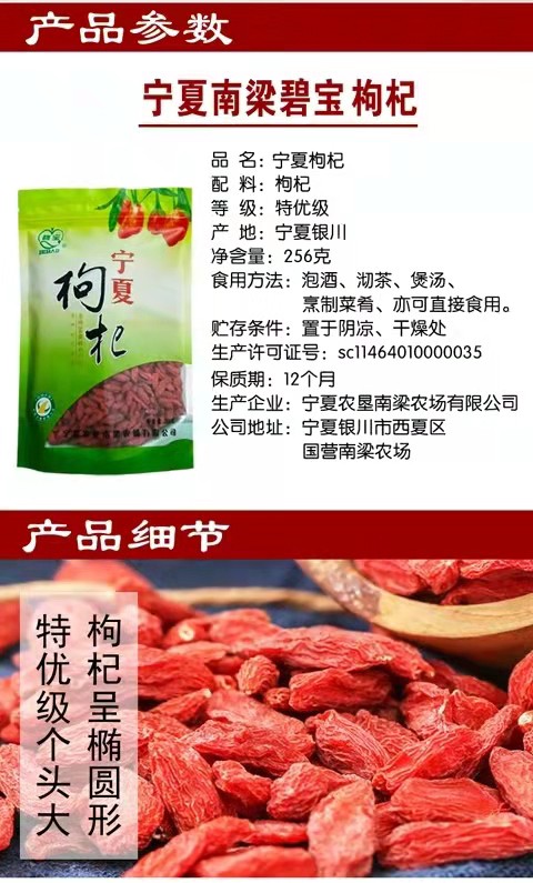 寧夏農(nóng)墾南梁農(nóng)場有限公司成立于1992年10月,隸屬于寧夏農(nóng)墾集團有限公司,是集科研、開發(fā)、種植、生產(chǎn)、加工、銷售為一體的自治區(qū)級農(nóng)業(yè)產(chǎn)業(yè)化龍頭企業(yè)。南梁枸杞已有50多年的栽培歷史,所產(chǎn)枸杞以粒大、肉厚、籽少、味甜、藥效高而享譽全國。 南梁農(nóng)場枸杞基地先后被國家、自治區(qū)確立為“萬畝優(yōu)質富硒枸杞生產(chǎn)基地”,“農(nóng)業(yè)部無公害農(nóng)產(chǎn)品示范基地農(nóng)場”,“全國農(nóng)業(yè)標準化示范基地”,“自治區(qū)農(nóng)業(yè)產(chǎn)業(yè)化重點龍頭企業(yè)”等稱號。公司主要產(chǎn)品為“碧寶牌” SOD富硒枸杞、“南梁”牌枸杞。主導產(chǎn)品“碧寶牌” SOD富硒枸杞獲得國家專利和綠色食品證書,多次獲得中國農(nóng)業(yè)博覽會金獎、馬來西亞國際金獎、兩屆中國專利新技術新產(chǎn)品博覽會金獎在內的多項國際國內金獎。