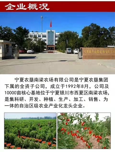 寧夏農(nóng)墾南梁農(nóng)場有限公司【原寧夏枸杞企業(yè)(集團)公司】成立于1992年8月,位于銀川市西夏區(qū)南梁農(nóng)場,是寧夏農(nóng)墾集團有限公司所屬的枸杞種植、加工、銷售為一體的專業(yè)化公司。已有50多年的枸杞栽培歷史,所產(chǎn)枸杞素以粒大、肉厚、籽少、味甜、藥效高而居寧夏枸杞之冠。